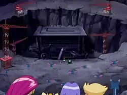 The Iron Ruins appeared in Steeling Peace of Mind! and Saving the World From Ruins!. Unlike in the games, they have no connections to Registeel in the anime, but rather Dialga and Palkia. Team Galactic conducted experiments at the ruins in order to locate the Spear Pillar on Mt. Coronet, which also caused all of the Steel-type Pokémon on the island to go berserk. When Mars placed the Spear Key into a stone pillar, a beam of energy shot out of the ruins and struck Mt. Coronet, allowing Team Galactic to start scanning it order to locate the entrance to the Spear Pillar. However, due to the efforts of Ash and his friends, the machine used to run the experiment was destroyed when the scan was only 60 percent complete.