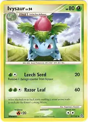 Razor Leaf and Leech Seed are both moves in the Pokémon games that Ivysaur can learn. This card's Pokédex entry comes from Pokémon Diamond and Pearl.