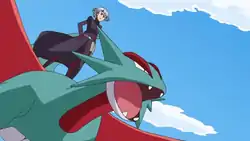 Salamence exhibited little real personality in its various appearances other than being extremely loyal to J, as show in Pokémon Ranger and the Kidnapped Riolu! Part One when it was commanded by J to use Flamethrower on a forest just so J could capture a Riolu for profit. In many of the battles Salamence partook in, it barely took damage from its opponents' attacks and had quick movements that allowed it to not get hit by them as well. Similar to Giovanni with his Persian, J appears to value Salamence more than her other Pokémon, and it was used more often by her.