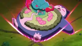 Suddenly, mysterious red lights appear and float towards Snorlax. A burst of energy then engulfs Snorlax, causing it to swell to enormous proportions before it emerges in its Gigantamax form. Goh is quick to point out that Snorlax is now blocking the train tracks, adding that a train is due to pass through in the next eight minutes. Ash has Pikachu use Thunderbolt, but Snorlax is only mildly disturbed and fires off a Hyper Beam in its sleep. Ash resorts to yelling but quickly shelves that idea when Goh points out the giant berry growing from the tree now sprouting from Snorlax. Goh figures that Snorlax will wake up if they feed it the berry. Ash is all in and begins to climb on Snorlax and onto its tree. Goh clambers up with some struggle, before ordering Ash to drop the berry. However, Pikachu's Iron Tail fails to cut through the thick stem and now only four minutes remain before the train arrives. Ash leaps onto the berry, and using his added weight he swings the berry as Pikachu attacks the stem with a flurry of Iron Tails. The berry drops as planned, but gets caught up in the growing shrubs. Goh tries to push the berry, but his might isn’t enough. As the crossing signals sound, the situation grows tense. Luckily, Scorbunny leaps in to help. Goh notices Scorbunny's feet digging into the ground as it tries to push the berry. He recalls Scrobunny's powerful kicks and orders it to use Double Kick. Scorbunny follows suit and the force is enough to cause the berry to rolls towards Snorlax's mouth. Snorlax leaps upwards to grab the berry, and as it plummets, the shockwave stops the approaching train.