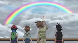 Ash and the others eventually reach the outdoors. They pause momentarily after coming across a fleet of worn stairs, helping each other up to the top floor. Goh is relieved to see the rain has now stopped. Chad proceeds to wave around the Rainbow Wing and calls out to Ho-Oh. Moments pass, when suddenly a rainbow appears in the sky. Chad again calls for Ho-Oh. A rush of wind then blows the Feather out from his hand, though Jaye catches it. Jaye admits he has learned a lot from today and goes on to wave around the Rainbow Wing in a bid to finally meet Ho-Oh. Ash, Goh, and Chad are all greatly encouraged by Jaye's regained hope, and chip in to call for Ho-Oh. However, they soon stop, as their calls go unanswered. Jaye isn't disappointed, and instead asks Chad to accompany him during his future searches. Chad happily agrees to it. Unexpectedly, the Wing begins to glow in all colors of the rainbow. Ash's stomach then grumbles, so Chad invites him over to his house for some homemade curry. As the three boys begin walking away, Jaye catches sight of Ho-Oh in the distance. He calls for the boys to turn around, but it is too late. Nonetheless, Jaye smiles having finally caught sight of Ho-Oh after many decades.