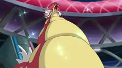 Both Leon and Lance are determined to keep the battle going and recall their Pokémon in preparation for their next moves. Lance activates the Dynamax Band on his wrist, causing Gyarados's Poké Ball to grow giant, before throwing it and sending out his now-Dynamaxed Gyarados. Ash and Goh are astounded to see Dynamaxing being used in Galarian Pokémon battles, and understand that this is what Professor Cerise had meant with the stadium being "full of surprises". Team Rocket is also excited to witness Dynamaxing with their own eyes. Leon responds to Lance's move by Gigantamaxing his Charizard, making the match a Dynamax battle.