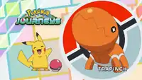 Ash and Goh arrive in Mauville to find the city half-buried in sand. With a new Pokémon mystery to uncover, Ash quickly cheers up. Putting on their Go-Goggles, the boys and their Pokémon walk directly into the sandstorm. They brave the vortex winds to reach the eye of the storm where they rush towards the distant cries for help. As three people are dragged into a pit, a Trapinch appears, snapping its jaws. Goh consults his Pokédex, learning that Trapinch dig bowl-shaped pits to trap and hunt prey. Goh decides he will have to catch the Trapinch to save the people. A standard throw fails, but his curveball manages to catch the Trapinch. The three people thank their rescuers before leaving.