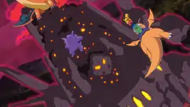 Following Giovanni’s orders, Team Rocket have infiltrated the underground Energy Plant as miners hoping to locate the evilest Pokémon. Oleana continues to inject more Galar Particles at the Energy Plant core, leading to more Dynamax events, including a wild Coalossal. Chairman Rose is unfazed by the threats of Dynamax energy, declaring that soon Eternatus will be revived and save Galar's future. Ash and Leon soon spot the rampaging Gigantamax Coalossal. Using Gengar and Dragapult respectively, they manage to defeat it. The miners start throwing stones at the Coalossal, but Ash intervenes to protect the vulnerable Pokémon.