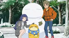 The next day, back in the lab, Chloe thanks Chrysa for the night, before the latter begins her daily work. Chloe finds Ash and Goh having breakfast, though they admit that they weren't able to catch any Ice Pokemon but met a person with a Psyduck wearing a scarf, which intrigues Chloe, who sets off to find the Trainer, with Ash and Goh in tow, but to no avail. They, however, find the Psyduck and its Trainer, after the Duck Pokemon repeated the same act it did to Chrysa, to Chloe. The latter drags the man to the Cerise Laboratory where Chrysa is sweeping the snow. An emotional reunion takes place between Chrysa and not the man, but his Psyduck, much to Chloe's shock, while Ash and Goh and their Pokemon are left confused. Chrysa then takes another photo with the Psyduck, along with everybody else present, and keeps it on her lab desk, thanking a rather annoyed Chloe for the reunion.
