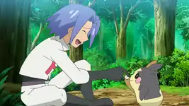 Team Rocket has landed on a tree, hanging upside down from it, until they spot Morpeko nearby, calling out to them. Jessie and Meowth quickly hide and decide to let it pass by, but James, seeing how Morpeko came looking for them, climbs down and calls out to it. He then pulls out a Poké Ball and tosses it at the Two-Sided Pokémon, catching it. He immediately lets Morpeko back out and officially welcomes it to the team. As the trio prepares to head back, however, Morpeko's Hangry Mode is suddenly activated and it attacks the trio with Aura Wheel again, blasting them off once more.