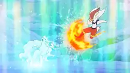 Once the weather clears, Quillon tells Ash and Goh to leave, but Goh protests, noting that the time limit isn't over yet. He's also figured out something: since Ninetales originally lived on Mount Lanakila, it might want to live somewhere that looks like its former home, such as a nearby mountain peak. Quillon follows Ash and Goh there, where they indeed find Ninetales. They try to convince Ninetales to let them catch it so they can take it back home, but it remains hostile towards them. As such, Goh is forced to battle it, calling out his Cinderace and telling it to use Quick Attack, which gets countered by Ninetales's Dazzling Gleam. Cinderace next goes for a Blaze Kick, while Ninetales sets up an Aurora Veil to protect itself. Goh tells Cinderace to power through with Pyro Ball, which, despite being weakened by the defensive barrier, still hits Ninetales.