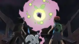 A sudden loud noise coming from the luxury coach catches everyone's attention. When Goh and Allister look out the window, the luxury coach's roof is blown off and a Spiritomb emerges from it. Allister translates its speech, revealing that the Forbidden Pokémon is demanding for its spirit to be returned. Goh is surprised to see Allister being able to understand Spiritomb, but his attention is quickly redirected to Ash, whose face has now changed to completely match that of Spiritomb. Allister reveals that an ill-natured spirit from Spiritomb is residing within Ash, explaining his odd behavior. Pikachu tries to shock Ash to drive the spirit away, but it doesn't work. However, as the train rocks, a branch from a tree falls on Ash's head, knocking him out.
