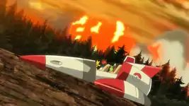 Heatran fires a beam of energy at the space-time gate in the sky, before starting to move towards it, setting a forest ablaze as it lumbers through it. The Legendary Pokémon is spotted by Ash and his friends, who realize that the flames they saw in their vision were those of Heatran. The Team Galactic Commanders, pursuing Heatran on a helicopter, theorize it's headed for the Spear Pillar. Saturn is delighted by this, but his attention is focused elsewhere when he spots Ash and his friends approaching Heatran as well. The group also realizes that Heatran's destination could be the Spear Pillar, and given that it was where Team Galactic enacted their big plan, they suspect the villainous team being behind this incident as well. They cut ahead of Heatran and prepare to put out the flames surrounding it with their Water Pokémon, but Brock says the fire is too intense and they have to figure out another plan.