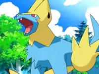 Later, it was captured by Jessie, though it evolved into a Manectric and took care of Team Rocket. After its remarkable performance, Manectric officially graduated from the Pokémon Training Center, and Cal escorted it to work at an electrical generator to help produce electricity. Manectric's known moves are Charge, Thunder, and Thunderbolt. | ||