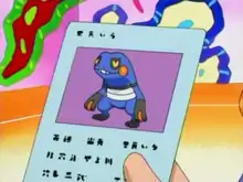 At times, instead of a Pokédex, he uses a deck of cards to identify Pokémon, such as in Gymbaliar! when he first learned of Croagunk's Poison Jab, or in Mass Hip-Po-Sis! when he used it to look up Hippopotas. The cards, used in the Sinnoh region, shared similar details to an electronic Pokédex, including statistics like height and weight.