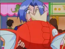 James purchased his Gyarados as a Magikarp on the St. Anne in Battle Aboard the St. Anne. While on the ocean liner, the Magikarp salesman tricked him into buying Magikarp, claiming that he could breed it to sell more and more Magikarp. Blinded by the chance to become rich, James gladly accepted the deal. When he later told about his purchase to Jessie and Meowth, however, they revealed that he had been tricked: Magikarp was a completely useless Pokémon, and even its "gold" Poké Ball was just gold-plated. When James revealed that he had spent the advances on both his and Jessie's salaries to buy Magikarp, Jessie got furious, angrily telling him to return it immediately. However, before he could find the salesman again, Team Rocket's assault on the ship started, and James was forced to abandon his search to join the other Team Rocket Grunts. After the operation had been ruined by the passengers' rebellion, the rocking of the ship caused James to drop Magikarp's Poké Ball, and the trio kept chasing it throughout the ship, causing them to get trapped inside and knocked unconscious when the ship sunk soon after.