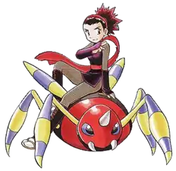 | Ariados is Janine's first known Pokémon. He was first seen being used to help Janine break into the Goldenrod Museum. Later, he was used to battle against Falkner during the Gym Leader exhibition tournament. Using its powerful thread, it managed to bind Falkner's Noctowl, forcing him to switch for his Skarmory. By using its abdomen, Ariados can produce a thread used for defensive techniques, such as Spider Web, while the thread shot from its mouth is sharp enough to pierce even metal with enough time.
