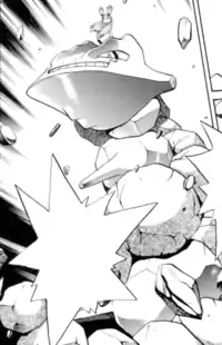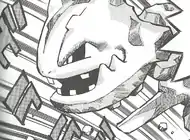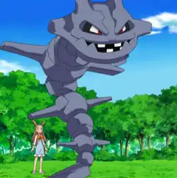 Jasmine first used Steelix to battle Brock at the Pokémon League. He was initially disguised as an Onix, which confused everyone else at his strange appearance. After chipping away at the gravel covering his body, Brock uncovered his true identity but was unable to defeat him. Steelix defeated Brock's Onix with Crunch, giving Jasmine the win. | ||