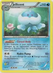 This card features both the male and female forms of Jellicent. Cursed Body is an Ability in the Pokémon games that Jellicent can have. Hydro Pump is a move in the Pokémon games that Jellicent can learn. This card's Pokédex entry comes from Pokémon Black.