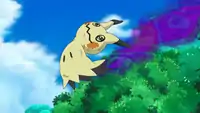 Mimikyu first appeared in Loading the Dex!, where it met Team Rocket in a forest on Melemele Island. Thinking it was cute, Jessie decided to catch Mimikyu. Having no offensive Pokémon yet, she threw Meowth at Mimikyu, but it was immune to Meowth's Fury Swipes. Losing his patience, Meowth tried to remove Mimikyu's rag, but was hexed, and had a near-death experience. Jessie and James were able to wake Meowth up, but were forced to give up and hide when they heard someone approach, who turned out to be Ash and his classmates. Having noticed Ash's Pikachu, Mimikyu became enraged. Ash attempted to catch Mimikyu, but Pikachu's Iron Tail had no effect due to Mimikyu's Ability Disguise. Mimikyu then beat up Pikachu using Play Rough. Before the battle between Pikachu and Mimikyu went too far, Team Rocket stepped in. Meowth jumped at Pikachu with Fury Swipes, but when Pikachu tried to counter, Mimikyu intervened. Speaking through Meowth, Mimikyu told Team Rocket that it would help them against Pikachu, expressing a deep-seated hatred for it. Before it could resume fighting Pikachu, however, a Bewear kidnapped Jessie and James. Meowth was able to get Mimikyu to disengage, and they chased Bewear.