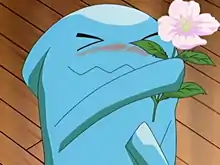 Wobbuffet usually serves as a comic relief character due to his goofy, energetic, and looney personality. He emerges from his Poké Ball frequently as a running gag, and often at inappropriate moments which frustrated Jessie at times. Team Rocket has also had various vehicles and robots based on him. James once remarked that he makes Misty's Psyduck look like a genius. Wobbuffet is also noted for his inability to recognize a wild Wynaut as a member of his own evolutionary family in Wynaut's debut episode.