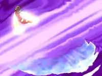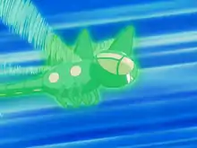 | Description: Yanmega lifts Seviper into the air. Then Seviper uses Poison Tail and Yanmega hits Seviper's tail with Silver Wind, creating multiple arrow-shaped purple beams. The combination was used during a two-on-two Contest Battle against Ursula's Plusle and Minun in the Daybreak Town Pokémon Contest. | |||