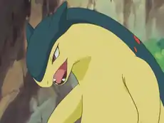 Jimmy used Typhlosion to defeat Shinji and his powerful Hitmonlee. After a hard-fought battle, Typhlosion and Jimmy emerged victorious and then complimented Shinji and his Pokémon. Later, Typhlosion was used in Jimmy's battle against Marina and Wani-Wani, where Typhlosion shrugged off Water Gun despite the type disadvantage. The battle was then interrupted because of Team Rocket's mission to capture Raikou.