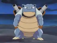 In Judgment Day!, Wartortle was caught by Team Rocket and tried breaking itself free from the mecha's prison Poké Ball-shaped capsules. When Jimmy held onto the mecha to rescue Wartortle, Team Rocket swatted Jimmy off of it and Wartortle, seeing Jimmy being beaten up by them, evolved into Blastoise. Due to its massive size, it broke itself free. With its newfound power, Blastoise easily defeated Team Rocket and sent them blasting off. Blastoise's only known move is Hydro Pump. | ||