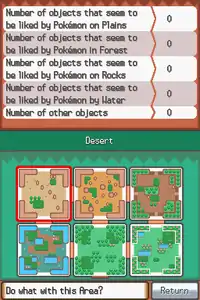 Customization happens on the Nintendo DS touch screen. By dragging and sliding the tiles with the stylus, the player can move them with ease. The exits to each area are arranged so that every conceivable arrangement of areas is possible: up to 2,985,984. In each specific area, the player can choose from several different objects and put up to 30 into the area, which can potentially draw out rarer Pokémon, Pokémon not found in the area, or Pokémon not found in the zone any other way. The specific layout of the Safari Zone may be shared by multiple players at one time, like other events in Generation IV, through record mixing or by using the Safari Zone Link.