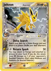 Jolteon δ (Japanese: サンダース δ Thunders δ) is a dual-type Lightning/Metal Stage 1 Pokémon card. It is part of the EX Delta Species expansion.