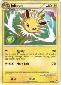 Agility is a move in the Pokémon games that Jolteon can learn. This card's Pokédex entry comes from Pokémon HeartGold. A Thunder Stone is featured in both illustrations.