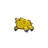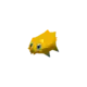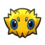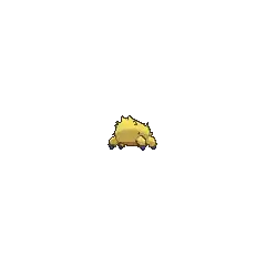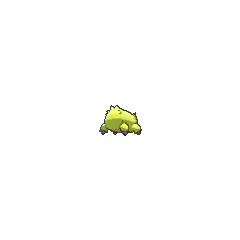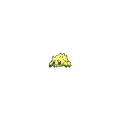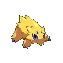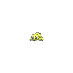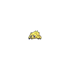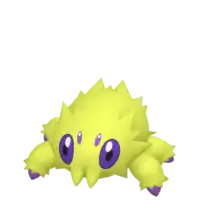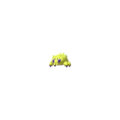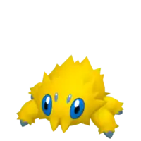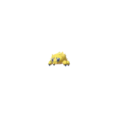At 4 inches (0.1 meters) tall, Joltik is one of the smallest Pokémon in existence. It has four legs tipped with blue, conical feet. Its ovoid body is completely covered in yellow fur, with notable tufts sticking out on each side of its face, just over each eye, and its lower back. Joltik has four blue eyes. The two larger eyes are set relatively far apart on its face, containing black pupils. The two smaller simple eyes are situated between the first pair, slightly higher up on its face. Joltik's mandibles point downward and reside at the bottom of its face, where they closely resemble tufts of hair.