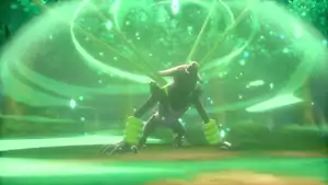 Zarude stands over the target and extends several green vines from its back, wrapping them around nearby trees. The vines on Zarude's back and around its arms then glow light green, and the ground around Zarude also glows light green, healing the target. | ||