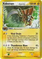 Kabutops δ (Japanese: カブトプス δ Kabutops δ) is a Lightning-type Stage 2 Pokémon card. It is part of the EX Holon Phantoms expansion.