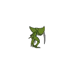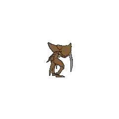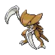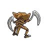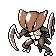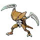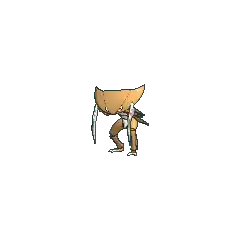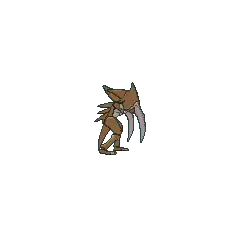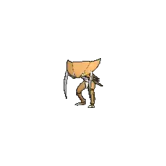 Kabutops is a bipedal Pokémon with a skeletal build. It has a flat, half-circular head with a point on each side and two small eyes on the front. It is mostly brown, except for its light gray chest and abdomen. There is a ridge down its back with three flat spines on either side and it has a flat, pointed tail. Instead of hands, its forearms have large, sharp, gray scythes. Its thin legs are brown lead to small feet with two large gray claws.