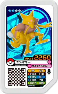 Kadabra (Japanese: ユンゲラー Yungerer) is a Grade 2 Pokémon Ga-Olé disk. It is part of the third Grand Rush set.