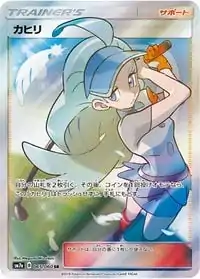 Kahili was introduced as a Supporter card in the Pokémon Trading Card Game during the English Sun & Moon Series (the Japanese SM Era). It was first released in the Japanese Thunderclap Spark expansion before debuting in English in the Lost Thunder expansion, with the background artwork by Ken Sugimori. It was also released as a Full Art card in Thunderclap Spark and Lost Thunder, with an illustration by Megumi Mizutani. It allows the player to draw 2 cards and it has a chance to return to the player's hand.