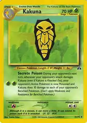 Kakuna (Japanese: コクーン Cocoon) is a Grass-type Stage 1 Pokémon card. It is part of the Neo Discovery expansion.