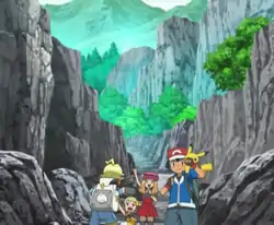 After the forest is Kalos Canyon as shown in Battles in the Sky!. Ash and his friends visited the Reflection Cave in The Cave of Mirrors!. A Pokémon Center is located somewhere after the cave as mentioned in the episode. After the cave is a forested path, which was visited in Forging Forest Friendships!. After the forest is the location of Kalos's Pokémon Summer Camp, as shown in Summer of Discovery!. It is located along the coast of Kalos.