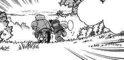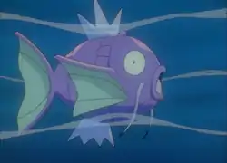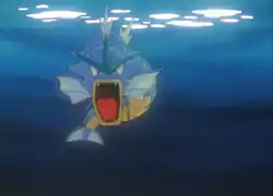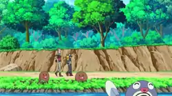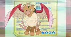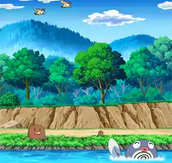 After jumping in the river, narrowly evading an attack from a Magikarp and Gyarados, Ash and Pikachu met Misty, who was fishing for Water Pokémon. He stole her bike, putting the injured Pikachu in its basket, and rode away, promising that he would bring it back someday. They were attacked once again by the Spearow, but Pikachu used a massive electrical attack to take out the entire flock. Once the storm cleared, Ash and Pikachu both rose from where they were knocked back on the ground, exhausted but victorious. Ash looked up and saw an unknown Pokémon majestically flying through the sky, over the rainbow that had been left after the storm, but his Pokédex could not identify the species.