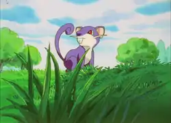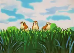 Ash turned and saw a group of Pidgey in the field; he threw a rock at them, which only scared them away. However, he saw another bird Pokémon in the field, mistook it for another Pidgey, and threw another rock at it, which hit it in the back of its head. When it turned to look at him, however, he realized that he actually hit a Spearow. The Spearow swooped several times to attack him and Pikachu.