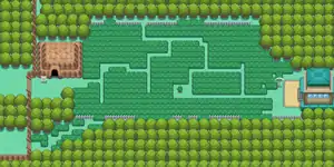 West of the station, the route is completely surrounded by grass patches. To avoid encounters with wild Pokémon, Trainers can follow beaten dirt paths through the field. The first such path begins just west of the gate. The path turns south before resuming a westward alignment and turning north to intersect a short path that travels to the west. The main path continues north, then west to come to a near four-way intersection. The north and south paths ultimately lead to a dead end surrounded by grass while the west path continues toward Vermilion.