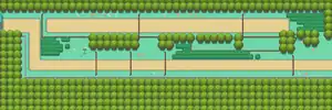 The number of grassy patches in the middle is now two, however, the east patch now occupies nearly triple the space. The flowers of the center of the route are moved to either the north or the south of the paths. A new patch of tall grass is added in the northeast of the route. Also, like in Generation II, the ledge at the west turns to the north and there is no path west of the gate.