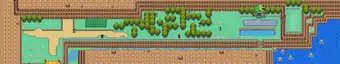 Route 25 continues east, turning south at the ocean shoreline and passing along a narrow strip of land between the ocean and the eastern pond. At the southern tip of the pond, the route turns west, intersecting the land bridge as it runs along the southern edge of the ponds. Just to the west of the pond, the route turns north for a yard before doubling back to the west, running along the southern edge of the route's main path as it feeds into the "express route", one way portion of Route 24. The existence of the long, narrow bypass south of Route 25 allows for quick, hassle-free travel between Cerulean Cape and its namesake city. However, due to a ledge at the southern terminus of Route 24 in Cerulean City, the reverse is not possible.
