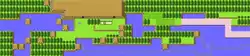 Route 27 begins as a water-logged route at its western terminus, requiring Trainers to surf east from New Bark Town to reach the first area of land along the route. After making landfall for the first time, a helpful Trainer near the shore will notify other Trainers that they have officially entered Kanto. The route continues east to a three-way intersection. The east path leads to the lower portion of a ledge and, ultimately, a dead end. The lack of a through route to the east forces Trainers to the north, where the path meets the western portal of the Tohjo Falls.