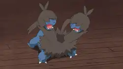 | Zweilous is Ryuki's first known Pokémon. Zweilous was first used to battle Kiawe and his Marowak, easily defeating Marowak when it got distracted by his music. Zweilous then battled Ash's Rowlet. It was soon joined by his Druddigon in a Double Battle against Rowlet and Meltan. Both Dragon Pokémon were soon defeated.