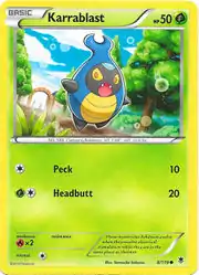 Karrablast (Japanese: カブルモ Kaburumo) is a Grass-type Basic Pokémon card. It is part of the Phantom Forces expansion.