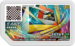 Kartana (Japanese: カミツルギ Kamiturugi) is a Grade 5 Pokémon Ga-Olé disk. It is part of the fourth Ultra Legend set.