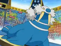 Then it faced Ash's Grovyle and was about to defeat it, but when Ash found out that Walrein was weaker without water underneath it, Ash made Walrein freeze the battle field, so Grovyle was able to defeat the Ice Break Pokémon with Leaf Blade. Walrein's known moves are Ice Beam, Body Slam, and Mimic. | ||