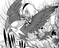 When a Steelix arrived, Hikoza was sent out to carry a person who was on there off of Steelix and to safety. Later, Hikoza took on some Grass-type and Bug-type Pokémon, and then faced off against Entei. During the race between Katsuya and his friends, Hikoza was sent out in order to Katsuya to save Toki from falling. Hikoza then battled Meganium after the fully-evolved Johto starters appeared. Hikoza's known moves are Double Kick and Flamethrower. | ||