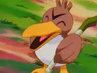 As Team Rocket jumped into his boat, it began to sink. Their Pokémon fell out, and Farfetch'd stole them. Later on, Ash and his friends find Keith and Farfetch'd. After a battle, Keith promised to return the Pokémon he stole and not to commit any crimes again. Farfetch'd's known moves are Fury Attack and Agility. | ||