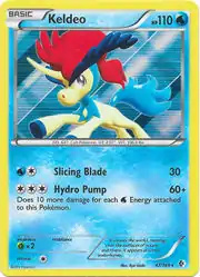 Slicing Blade is an attack originating from EX Sandstorm Armaldo as Blade Arms. Hydro Pump is a move in the Pokémon games that Keldeo can learn. This card's Pokédex entry comes from Pokémon White.