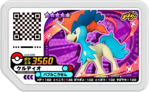 Keldeo (Japanese: ケルディオ Keldeo) is a Grade 3 Pokémon Ga-Olé disk. It is part of the fifth Ultra Legend set.