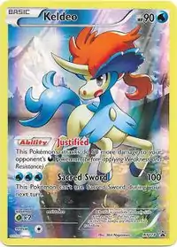 Justified is an Ability in the Pokémon games that Keldeo can have. Sacred Sword is a move in the Pokémon games that Keldeo can learn. This card's Pokédex entry comes from Pokémon Y.